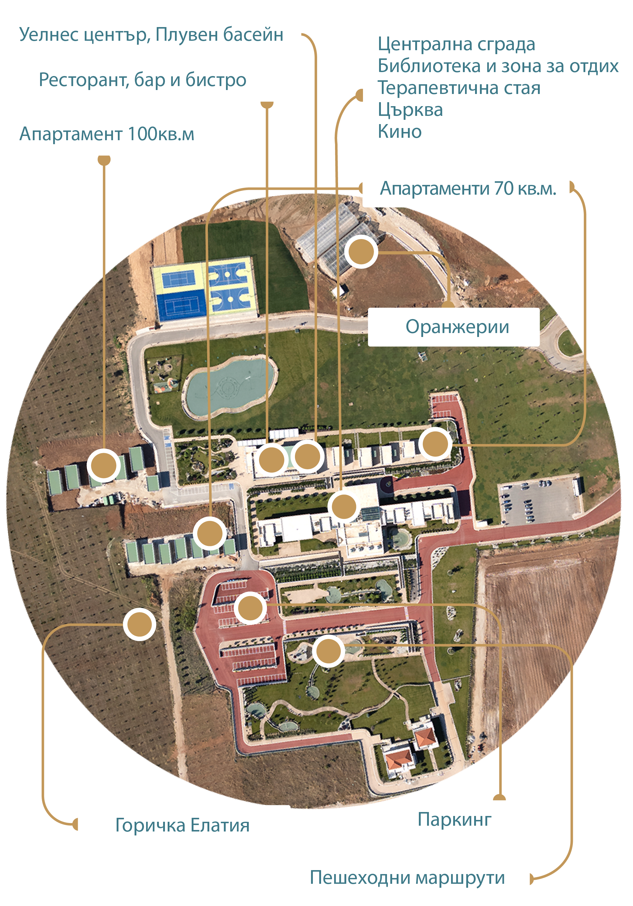 Комплексът включва 40 самостоятелни апартамента и 15 независими апартамента. В основната сграда се намират обществените помещения за хранене и развлечения, местата за отдих, центърът за грижи и уелнес и административните офиси.